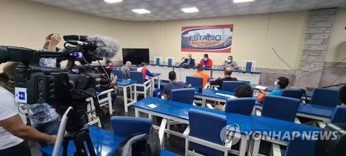 epa09691949 President of the World Baseball Softball Confederation (WBSC) Riccardo Fraccari (L) speaks during a press conference in Havana, Cuba, 17 January 2022. The President of the World Baseball Softball Confederation (WBSC), Riccardo Fraccari, said that progress is being made on a plan so that Cuban baseball players can legally play in foreign leagues. EPA/Felipe Borrego