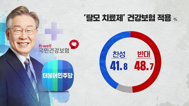 탈모 치료에 건강보험을 적용하는 것을 검토하겠다는 이재명 민주당 후보의 공약을 어떻게 생각하는지 물었는데 찬성 41.8%, 반대 48.7%로 반대가 우세했습니다.
