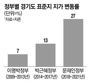 18일 부동산개발정보플랫폼 지존이 경기도 표준지 6만3613필지를 전수 조사한 자료에 따르면 문재인정부 출범 이후인 2018~2021년 지가가 27% 상승한 것으로 나타났다. 이명박정부 집권기인 2009~2013년과 박근혜정부 집권기인 2014~2017년 표준지 지가가 각각 7%, 13% 오른 것에 비하면 2~4배 높은 상승폭이다.