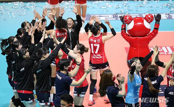 [광주=뉴시스] 권창회 기자 = 18일 오후 광주 서구 염주종합체육관에서 열린 도드람 2021-2022 V리그 페퍼저축은행과 IBK기업은행의 경기, 페퍼저축은행 선수들이 세트스코어 3 대 0으로 승리하고 기뻐하고 있다. 2022.01.18. kch0523@newsis.com