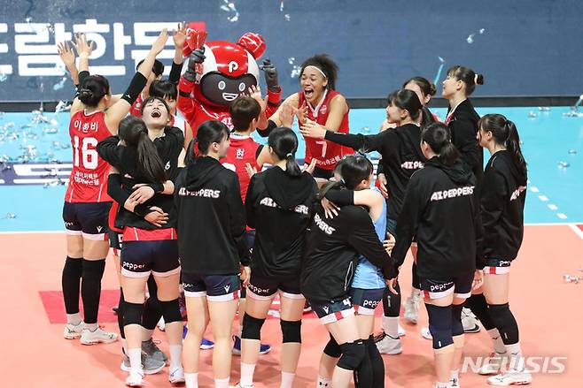 [광주=뉴시스] 권창회 기자 = 18일 오후 광주 서구 염주종합체육관에서 열린 도드람 2021-2022 V리그 페퍼저축은행과 IBK기업은행의 경기, 페퍼저축은행 선수들이 세트스코어 3 대 0으로 승리하고 기뻐하고 있다. 2022.01.18. kch0523@newsis.com