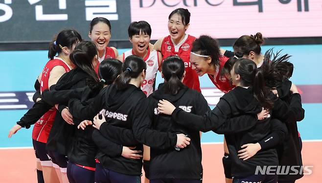 [광주=뉴시스] 권창회 기자 = 18일 오후 광주 서구 염주종합체육관에서 열린 도드람 2021-2022 V리그 페퍼저축은행과 IBK기업은행의 경기, 페퍼저축은행 선수들이 세트스코어 3 대 0으로 승리하고 기뻐하고 있다. 2022.01.18. kch0523@newsis.com