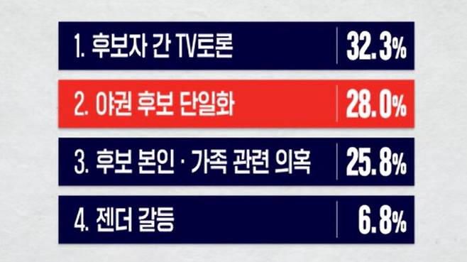가장 큰 대선 변수, 후보자 간 TV 토론부터 야권 후보 단일화, 후보 본인과 가족 관련 의혹, 젠더 이슈 순으로 나타났습니다.