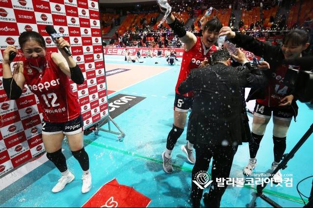【발리볼코리아닷컴(광주)=김경수 기자】18일(화) 광주광역시 서구 광주페퍼스타디움(염주종합체육관)에서 열린 프로배구 도드람 2021-2022 V리그 4라운드 여자부 페퍼저축은행vsIBK기업은행 광주경기에서 시즌 홈에서 첫번째 승리한 페퍼저축은행 김형실감독과 박경현에게 구솔과 최가은이 축하 물세레모니를 하고 있다. 2022.01.18.