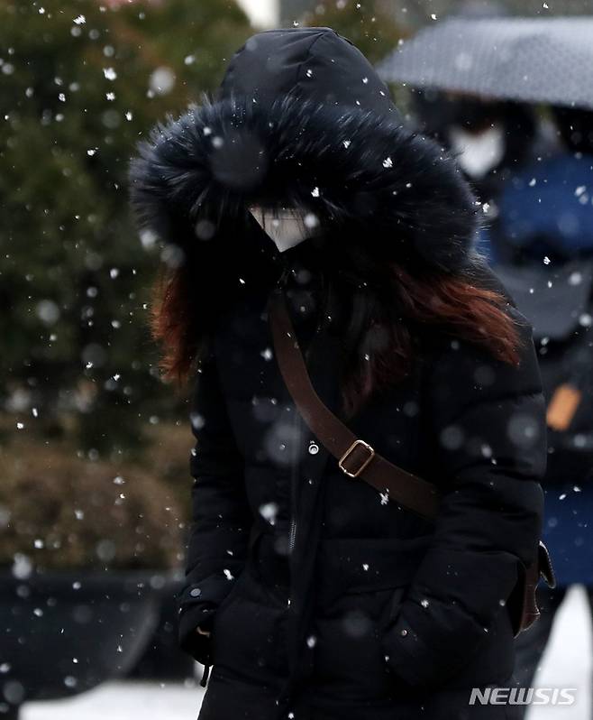 [서울=뉴시스] 추상철 기자 = 출근길 눈이 내린 19일 오전 서울 도심에서 시민들이 눈을 맞으며 발걸음을 재촉하고 있다. 2022.01.19. scchoo@newsis.com
