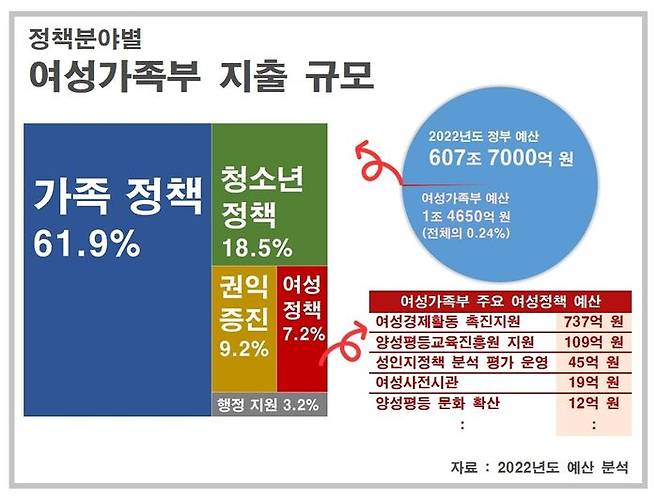일단, 여가부 업무는 여성 정책, 권익 증진, 가족 정책, 청소년 정책으로 분류됩니다. 2022년 편성된 여가부 예산은 1조 4,650억 원으로 전체 정부 예산의 0.24%입니다.