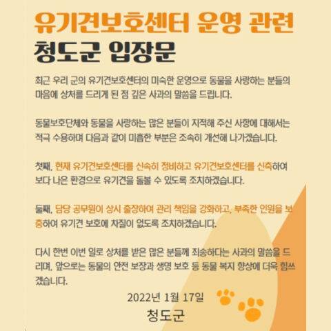 청도군은 입장문을 통해 "미숙한 운영으로 동물을 사랑하는 분들의 마음에 상처를 드리게 된 점 깊은 사과의 말씀을 드린다"며 "유기견 보호소를 신축해 보다 나은 환경에서 유기견을 돌볼 수 있도록 조치하겠다. 또 담당 공무원이 상시 출장해 관리 책임을 강화하겠다"고 밝혔습니다.