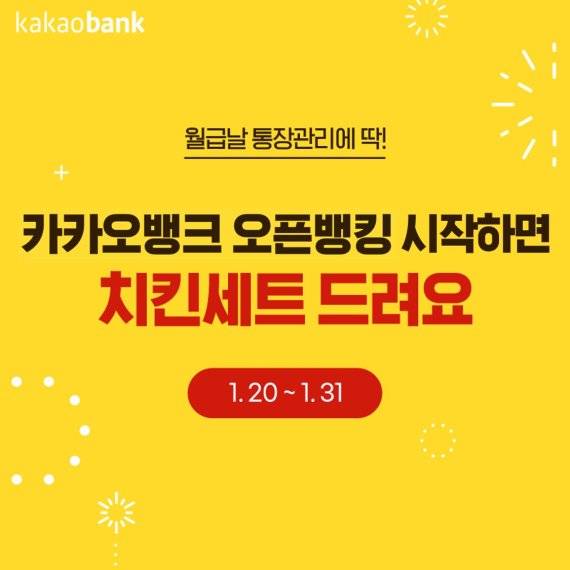 카카오뱅크는 오픈뱅킹 이용 고객 3000명을 추첨해 치킨 세트를 제공한다고 20일 밝혔다.