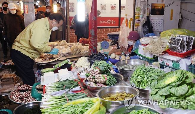 (서울=연합뉴스) 김인철 기자 = 김부겸 국무총리가 20일 서울 종로구 광장시장을 방문해 설맞이 물가·민생점검을 하고 있다. 2022.1.20