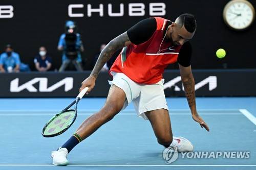 epa09696587 Nick Kyrgios of Australia lunges for a return during his second round Men?s singles match against Daniil Medvedev of Russia on day 4 of the Australian Open Tennis Tournament at Melbourne Park in Melbourne, Australia, 20 January 2022. EPA/DEAN LEWINS AUSTRALIA AND NEW ZEALAND OUT