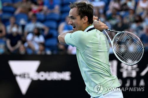 epa09696593 Daniil Medvedev of Russia plays a shot during his second round Men?s singles match against Nick Kyrgios of Australia on day 4 of the Australian Open Tennis Tournament at Melbourne Park in Melbourne, Australia, 20 January 2022. EPA/DEAN LEWINS AUSTRALIA AND NEW ZEALAND OUT