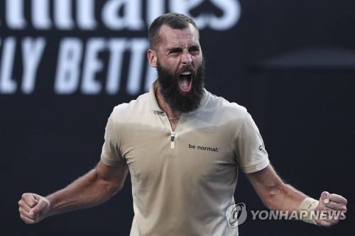epa09696601 Benoit Paire of France celebrates winning his second round match against Grigor Dimitrov of Bulgaria at the Australian Open Grand Slam tennis tournament in Melbourne, Australia, 20 January 2022. EPA/JASON O'BRIEN