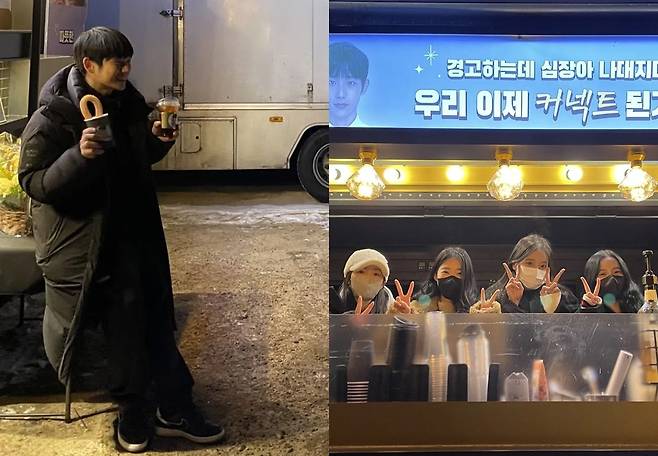 사진 속에는 커피와 츄러스를 들고 천사의 미소를 발산 중인 정해인의 모습이 담겨있다. 특히 그는 귀여운 버섯머리와 패딩 패션으로 눈길을 끌었다. 커피차 안에는 김혜윤, 정이서, 정신혜, 지수가 브이를 그리며 훈훈한 우정을 자랑했다.