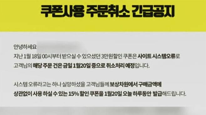 하지만 어제(20일) 오전 업체는 3만 원 할인쿠폰 발행이 시스템 오류였다며 이틀간의 모든 거래를 취소하겠다고 공지했습니다.