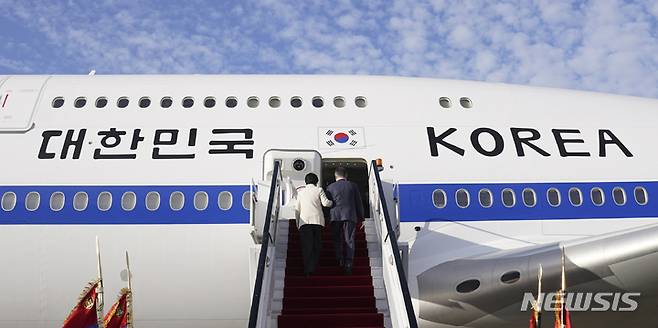[카이로=뉴시스] 김진아 기자 = 아랍에미리트(UAE), 사우디아라비아, 이집트 등 중동 3개국 순방을 마친 문재인 대통령과 부인 김정숙 여사가 21일(현지시간) 이집트 카이로 국제공항에서 귀국하기 위해 공군 1호기에 오르고고 있다. 2022.01.21. bluesoda@newsis.com