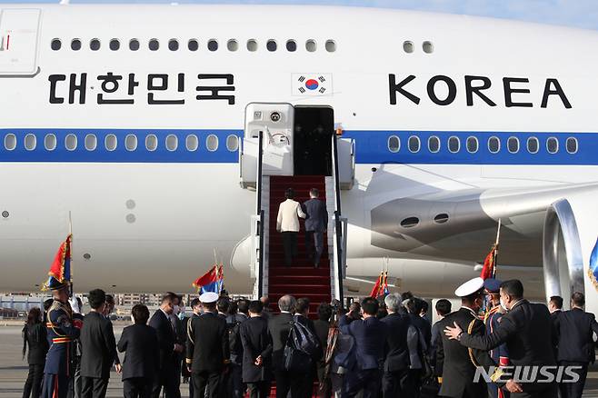 [카이로=뉴시스] 김진아 기자 = 아랍에미리트(UAE), 사우디아라비아, 이집트 등 중동 3개국 순방을 마친 문재인 대통령과 부인 김정숙 여사가 21일(현지시간) 이집트 카이로 국제공항에서 공군 1호기로 오르고 있다. 2022.01.21. bluesoda@newsis.com