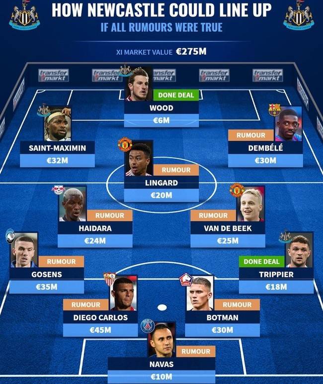 키어런 트리피어, 크리스 우드를 영입한 뉴캐슬은 추가 보강을 할 게획이다. 축구 통계 매체 '트랜스퍼마크트'는 이미 이적이 확정된 선수들, 기존 선수들과 함께 이적설이 나는 이들을 포함한 예상 베스트 일레븐을 공개했다.
