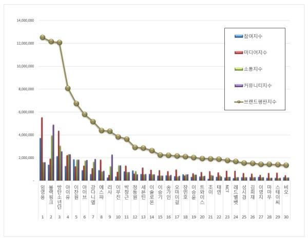 4위, 아이유 브랜드는 참여지수 1,270,216 미디어지수 2,219,909 소통지수 2,302,763 커뮤니티지수 2,303,875가 되면서 브랜드평판지수 8,096,765로 분석됐다. 지난 12월 브랜드평판지수 4,753,396과 비교하면 70.34% 상승했다.