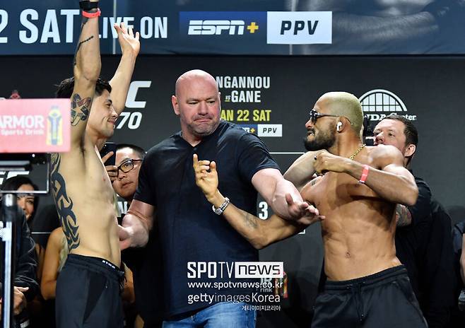 22일(이하 한국시간) 미국 애너하임컨벤션센터에서 열린 UFC 270 계체에서 은가누는 257파운드(약 116.57kg), 가네는 247파운드(약 112.04kg)로 체중계를 내려왔다.