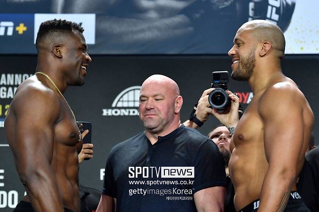 [스포티비뉴스=이교덕 격투기 전문기자] 프란시스 은가누(35, 카메룬)와 시릴 가네(31, 프랑스)는 스파링을 앞두고 있는 것처럼 서로를 향해 미소를 지었다.