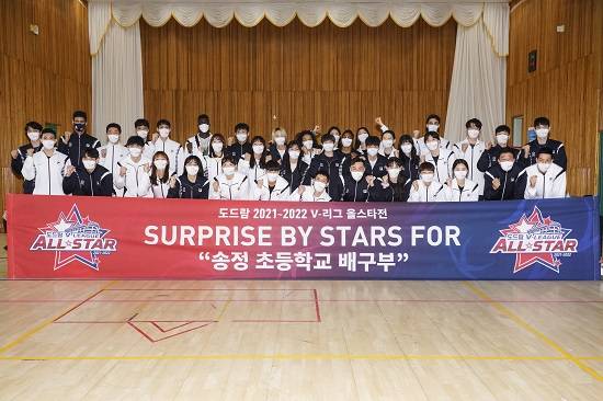 V-리그 올스타 선수들이 광주 페퍼스타디움 인근 초등학교 유소년팀을 찾아 깜짝 선물을 했다.