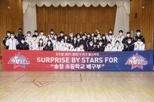 23일 개최되는 도드람 2021~2022 V-리그 올스타전에 하루 앞서 22일 오후 광주 송정초등학교를 찾은 선수들은 학생들 몰래 노후된 물품 보관실을 페인트칠하고 새로운 락커와 냉장고를 선물했다. 또한, 유소년 선수들을 위해 올스타전 초대권과 친필 사인 굿즈 등이 담긴 선물 패키지를 직접 포장해 전달하며 미래의 배구 꿈나무들을 위한 깜짝 서프라이즈 이벤트를 선사했다.