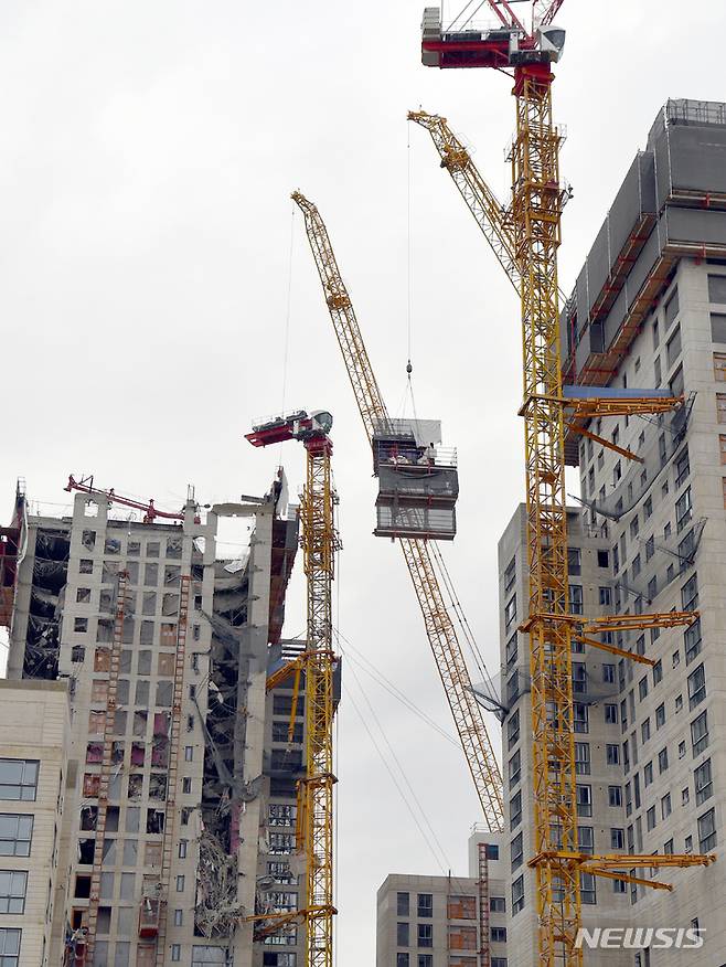 [광주=뉴시스] 류형근 기자 = 광주 서구 화정동 현대산업개발 신축 아파트 붕괴 사고 12일째인 22일 오후 구조당국 등이 고층에 있는 갱폼(거푸집) 제거 작업을 하고 있다. 2022.01.22. hgryu77@newsis.com