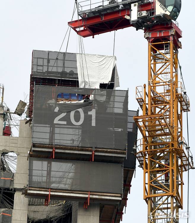 [광주=뉴시스] 류형근 기자 = 광주 서구 화정동 현대산업개발 신축 아파트 붕괴 사고 12일째인 22일 오후 구조당국 등이 고층에 있는 갱폼(거푸집) 제거 작업을 하고 있다. 2022.01.22. hgryu77@newsis.com