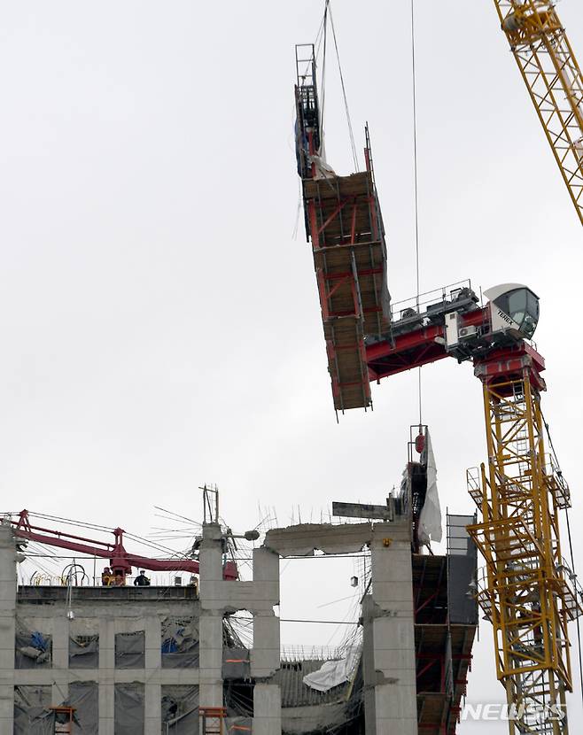 [광주=뉴시스] 류형근 기자 = 광주 서구 화정동 현대산업개발 신축 아파트 붕괴 사고 12일째인 22일 오후 구조당국 등이 고층에 있는 갱폼(거푸집) 제거 작업을 하고 있다. 2022.01.22. hgryu77@newsis.com