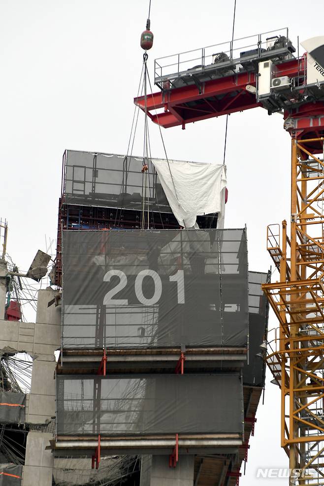 [광주=뉴시스] 류형근 기자 = 광주 서구 화정동 현대산업개발 신축 아파트 붕괴 사고 12일째인 22일 오후 구조당국 등이 고층에 있는 갱폼(거푸집) 제거 작업을 하고 있다. 2022.01.22. hgryu77@newsis.com