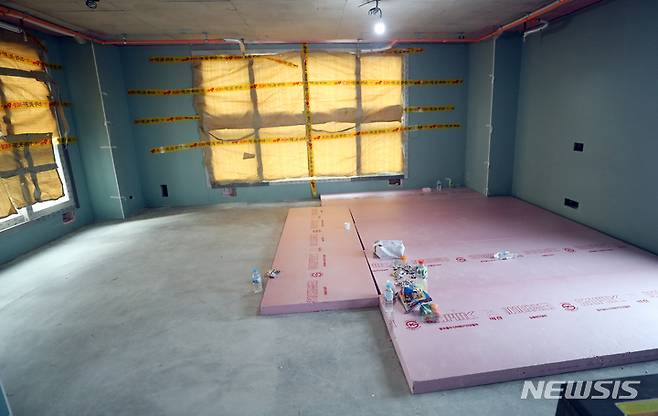 [광주=뉴시스] 류형근 기자 = 광주 서구 화정동 현대산업개발 신축 아파트 붕괴 사고 12일째인 22일 오후 신축 아파트 20층에 마련된 전진지휘소 내부에 대원들 쉼터가 만들어져 있다. (공동취재사진). 2022.01.22. photo@newsis.com