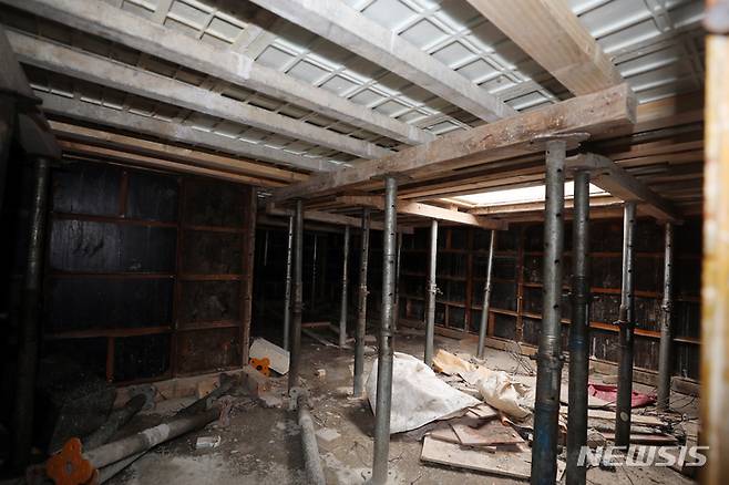 [광주=뉴시스] 류형근 기자 = 광주 서구 화정동 현대산업개발 신축 아파트 붕괴 사고 12일째인 22일 오후 아파트 39층을 받치고 있는 피트층 내부에 기둥이 세워져 있다. (공동취재사진). 2022.01.22. photo@newsis.com