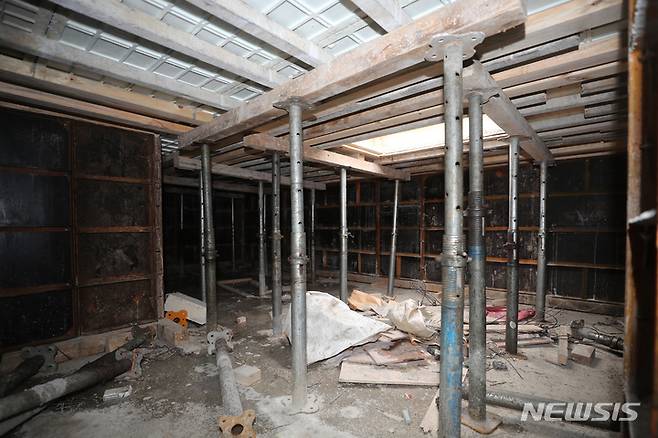 [광주=뉴시스] 류형근 기자 = 광주 서구 화정동 현대산업개발 신축 아파트 붕괴 사고 12일째인 22일 오후 아파트 39층을 받치고 있는 피트층 내부에 기둥이 세워져 있다. (공동취재사진). 2022.01.22. photo@newsis.com