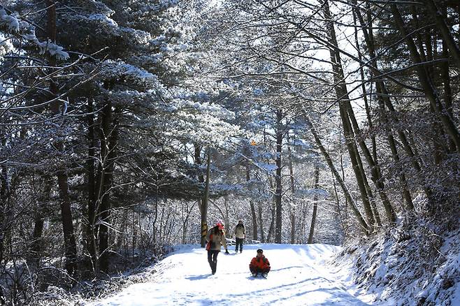 [인제=뉴시스] 김경목 기자 = 22일 오후 관광객들이 강원도 인제군 인제읍 원대리 자작나무 숲에서 겨울 정취를 만끽하고 있다. (사진=인제군청 제공) 2022.01.22. photo@newsis.com *재판매 및 DB 금지