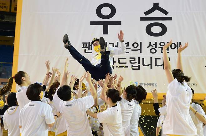 [서울=뉴시스] 고승민 기자 = 22일 충북 청주체육관에서 열린 '삼성생명 2021~2022여자프로농구' KB스타즈와 삼성생명 블루밍스 경기에서 승리해 정규리그 우승을 거머쥔 KB스타즈 선수들이 김완수 감독을 헹가래 치고 있다. (사진=WKBL 제공) 2022.01.22. photo@newsis.com *재판매 및 DB 금지