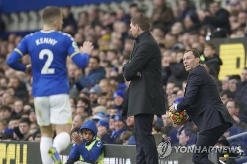 CAPTION CORRECTS ID OF EVERTON MANAGER Everton's caretaker manager Duncan Ferguson, right, prepares to throws the ball on the pitch, with Aston Villa's head coach Steven Gerrard at centre, during the English Premier League soccer match between Everton and Aston Villa at the Goodison Park stadium, in Liverpool, England, Saturday Jan. 22, 2022. (AP Photo/Jon Super) CAPTION CORRECTS ID OF EVERTON MANAGER