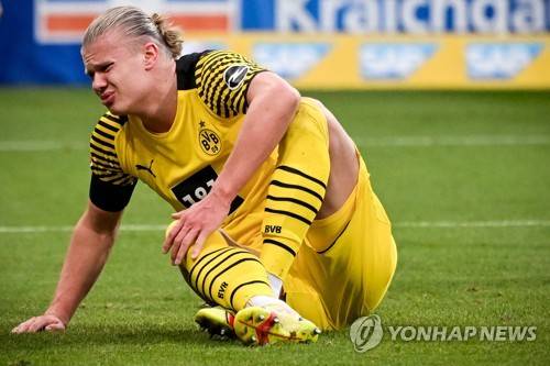epa09702191 Dortmund's Erling Haaland reacts after picking up an injury during the German Bundesliga soccer match between 1899 Hoffenheim and Borussia Dortmund in Sinsheim, Germany, 22 January 2022. EPA/SASCHA STEINBACH CONDITIONS - ATTENTION: The DFL regulations prohibit any use of photographs as image sequences and/or quasi-video.