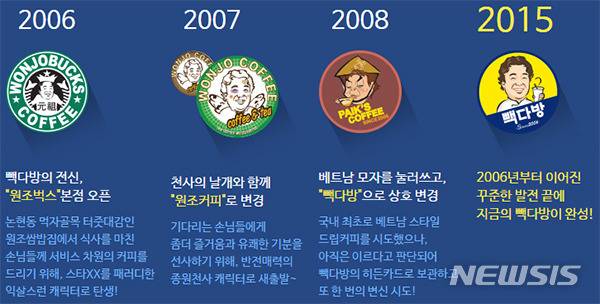 2008년 베트남 모자를 눌러쓴 백 대표 로고를 앞세워 빽다방으로 상호를 또 다시 변경했다. 이후 빽다방은 익살스러운 로고를 푸근한 백 대표의 모습으로 점차 변화시켜 나갔고 현재의 빽다방 로고가 만들어졌다.