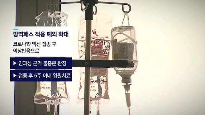 백신 때문에 이상반응이 생긴 거라고 인정하는 건 아니지만, 방역패스 확대에 따라 접종 미완료자의 생활에 불편이 커진 만큼 일부 대상자에 한해 편의를 봐준다는 취지입니다. 질병관리청에 따르면 현재 인과성 불충분 판정을 받은 사람은 382명(1.13 기준), 이상반응 의심 증상으로 접종 후 6주 내 입원 치료를 받은 사람은 1만 6천~1만 7천 명 정도입니다.