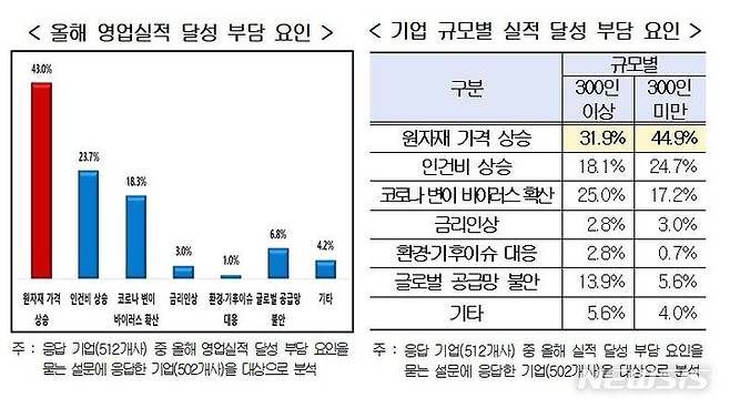 올해 기업의 영업실적 달성에 가장 부담이 될 것으로 예상되는 요인에 대해 응답기업의 43%는 ‘원자재 가격 상승’이라고 응답했다. 이 같은 응답은 300인 이상 기업(31.9%) 보다 300인 미만 기업(44.9%)이 높게 나타났다.
