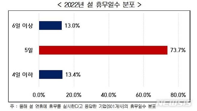 [서울=뉴시스] 최희정 기자 = 올해 설 휴무 실시 기업 중 73.7%가 5일간 휴무하는 것으로 나타났다.