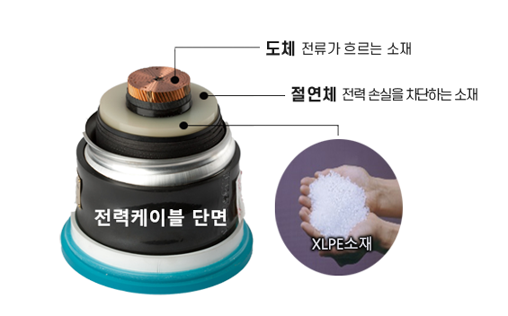 가교폴리에틸렌 XLPE(Cross Linked-Polyethylene)는 PE에 첨가제를 넣어 가교 반응을 통해 화학구조가 변형된 것입니다. 뛰어난 절연 및 내열 성능으로 전력 케이블의 재료로 이용되며, 주로 고압에 사용됩니다.
