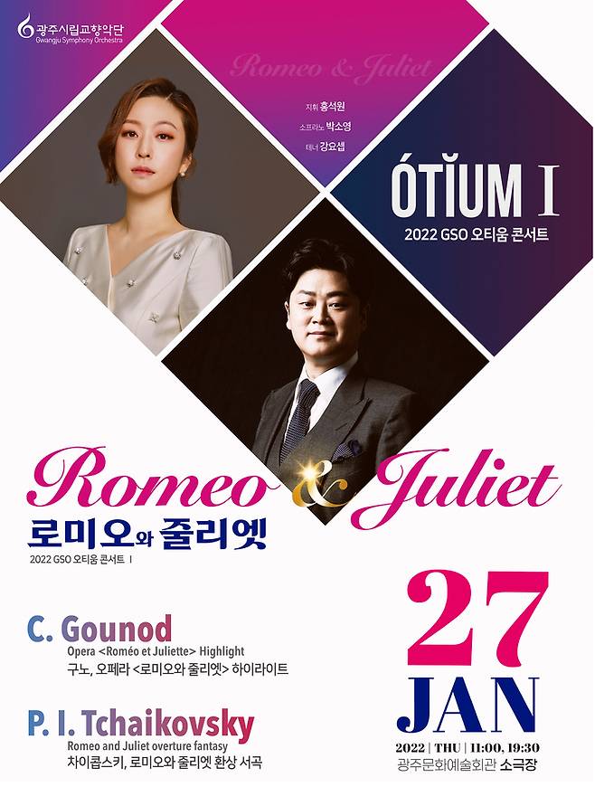 광주시립교향악단은 27일 오전 11시·오후 7시30분 광주문화예술회관 소극장에서 '오티움 콘서트-로미오와 줄리엣'을 공연한다.