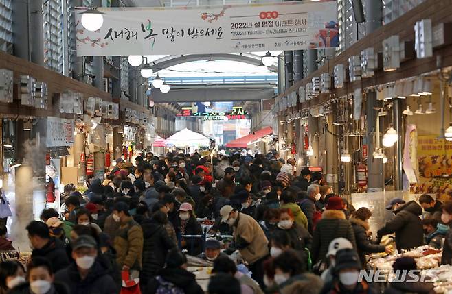 [서울=뉴시스] 조성우 기자 = 소상공인시장진흥공단에 따르면 올해 설 차례상 비용(4인 기준)은 평균 전 전통시장(26만 2,645원)이 대형마트(34만 1,859원)에 비해 7만 9,214원 가량 저렴한 것으로 나타났다. 설 명절을 일주일 앞둔 23일 서울 동대문구 청량리 종합시장이 장을 보는 시민들로 북적이고 있다. 2022.01.23. xconfind@newsis.com
