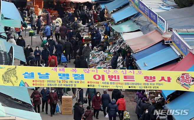 [서울=뉴시스] 조성우 기자 = 소상공인시장진흥공단에 따르면 올해 설 차례상 비용(4인 기준)은 평균 전 전통시장(26만 2,645원)이 대형마트(34만 1,859원)에 비해 7만 9,214원 가량 저렴한 것으로 나타났다. 설 명절을 일주일 앞둔 23일 오후 서울 동대문구 경동시장이 장을 보는 시민들로 북적이고 있다. 2022.01.23. xconfind@newsis.com