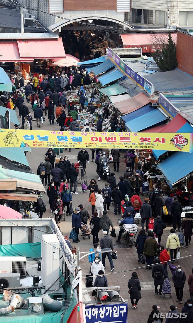 [서울=뉴시스] 조성우 기자 = 소상공인시장진흥공단에 따르면 올해 설 차례상 비용(4인 기준)은 평균 전 전통시장(26만 2,645원)이 대형마트(34만 1,859원)에 비해 7만 9,214원 가량 저렴한 것으로 나타났다. 설 명절을 일주일 앞둔 23일 오후 서울 동대문구 경동시장이 장을 보는 시민들로 북적이고 있다. 2022.01.23. xconfind@newsis.com