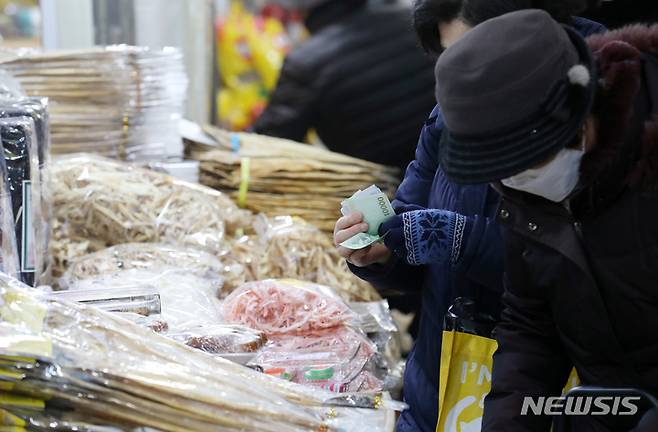 [서울=뉴시스] 조성우 기자 = 소상공인시장진흥공단에 따르면 올해 설 차례상 비용(4인 기준)은 평균 전 전통시장(26만 2,645원)이 대형마트(34만 1,859원)에 비해 7만 9,214원 가량 저렴한 것으로 나타났다. 설 명절을 일주일 앞둔 23일 서울 동대문구 경동시장에서 시민들이 장을 보고 있다. 2022.01.23. xconfind@newsis.com