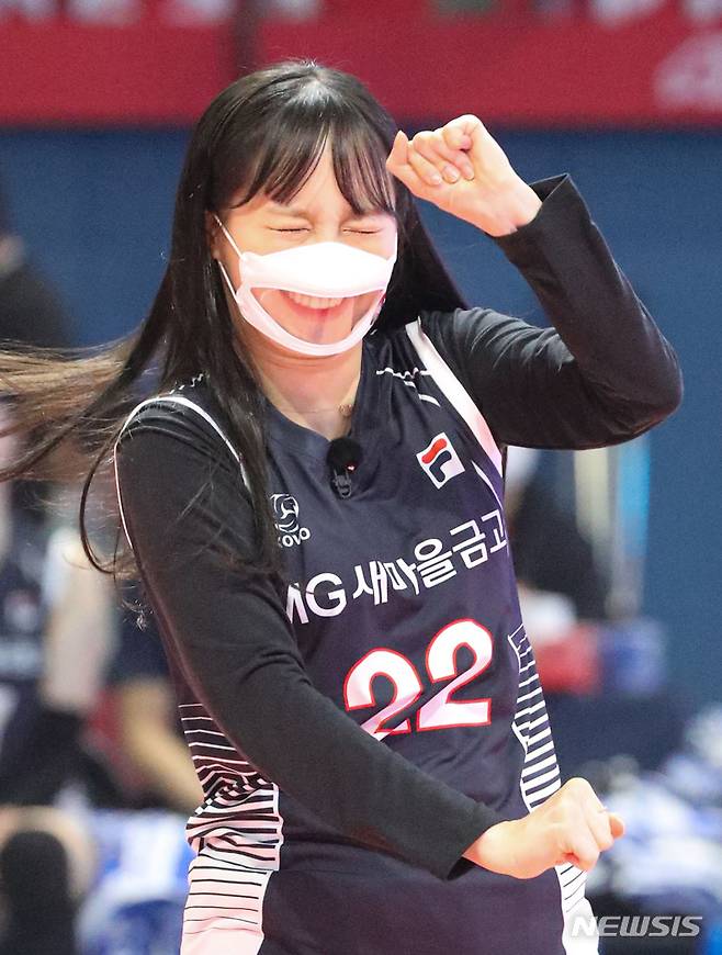 [광주=뉴시스] 권창회 기자 = 23일 오후 광주 서구 염주종합체육관에서 열린 '도드람 2021-2022 V리그 올스타전'에서 이달의소녀 츄가 승리 세레모니를 하고 있다. 2022.01.23. kch0523@newsis.com