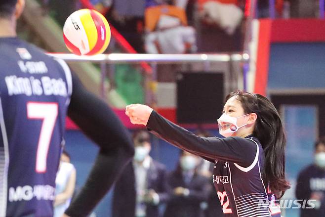 [광주=뉴시스] 권창회 기자 = 23일 오후 광주 서구 염주종합체육관에서 열린 '도드람 2021-2022 V리그 올스타전'에서 이달의소녀 츄가 서브를 하고 있다. 2022.01.23. kch0523@newsis.com