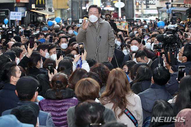 [안성=뉴시스] 국회사진기자단 = 이재명 더불어민주당 대선 후보가 23일 경기 안성시 명동거리에서 열린 '매타버스' 안성, 민심 속으로! 행사에서 시민들에게 연설을 하고 있다. 2022.01.23. photo@newsis.com